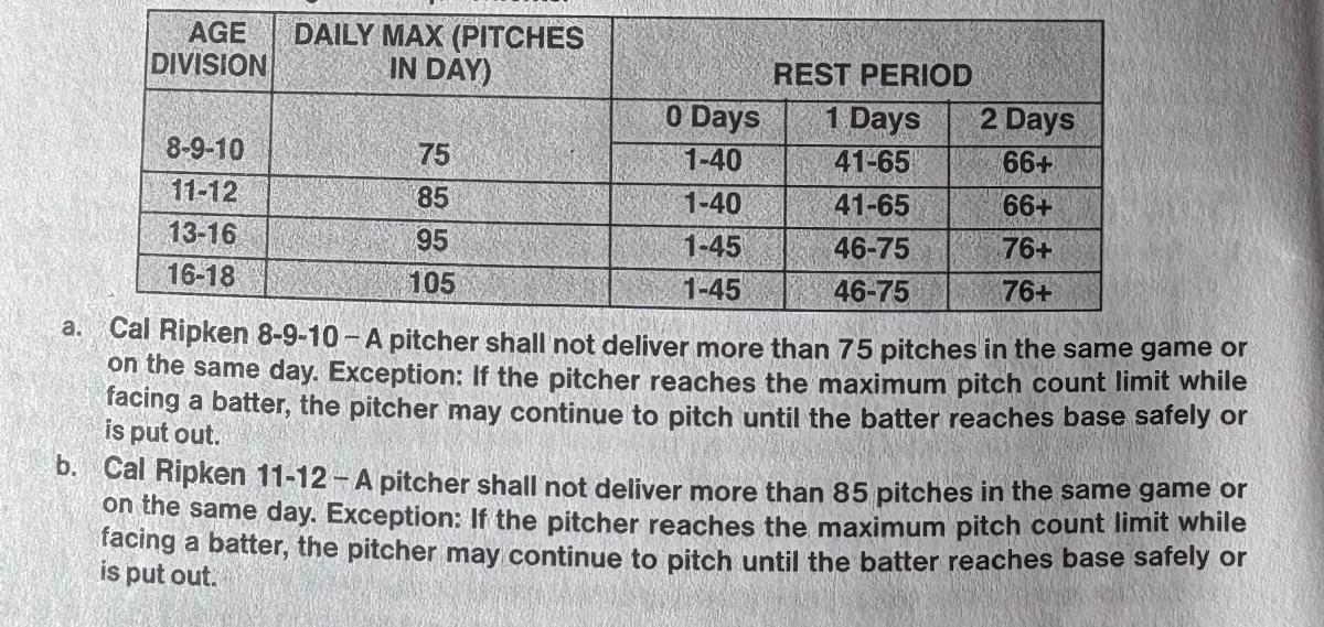 Pitching: Medford Baseball will follow Babe Ruth League, Inc. pitching regulations that state a pitcher shall not deliver more than 75 pitches in the same game or on the same day. If a pitcher pitches 1-40 pitches in a game or day, no rest is required. If a pitcher pitches 41-65 pitches in a game or day, 1 day rest required. If a pitcher pitches 66 plus pitches in a game or day, 2 days rest required.